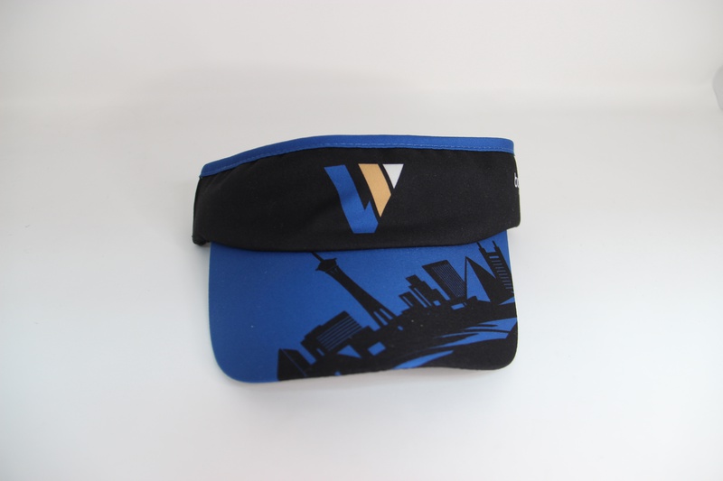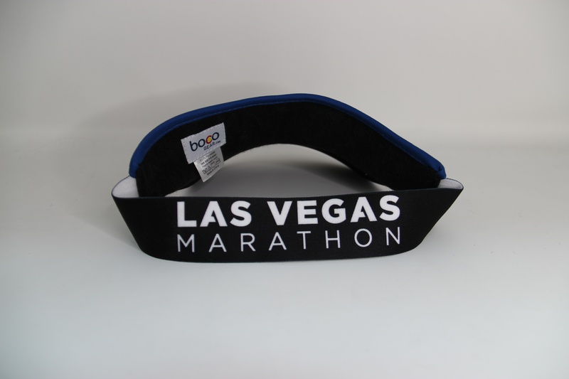 Las Vegas Marathon performance visor. Black & blue BOCO brand visor with a a city skyline design on the bill.