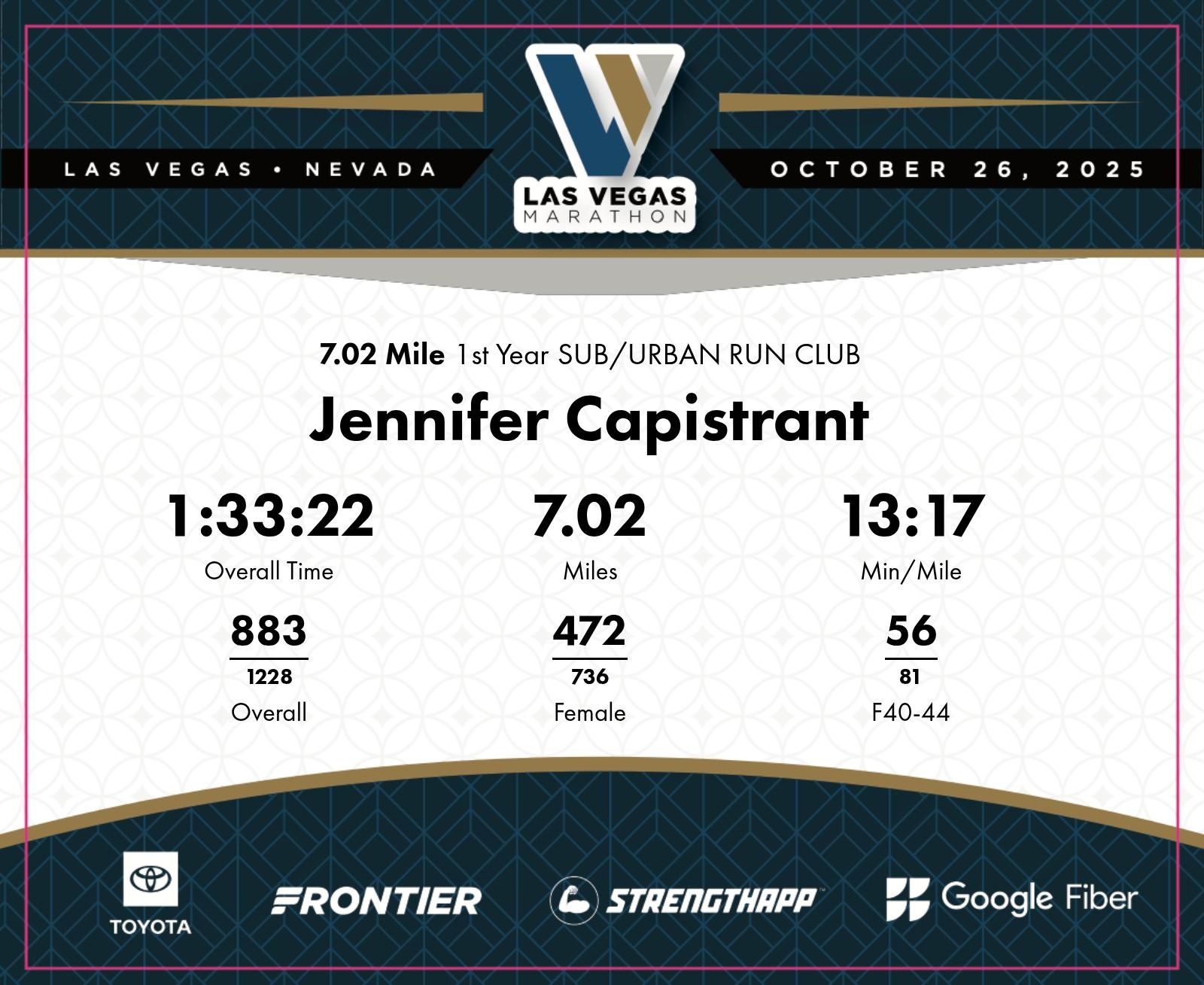 Date: Oct. 26, 2025 Participant: Jennifer Capistrant #5564 Race: 2025 Las Vegas 7.02 Mile Distance: 7.02 miles