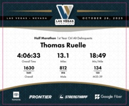 Date: Oct. 26, 2025 Participant: Thomas Ruelle #4643 Race: 2025 Las Vegas Half Marathon Distance: 13.1 miles