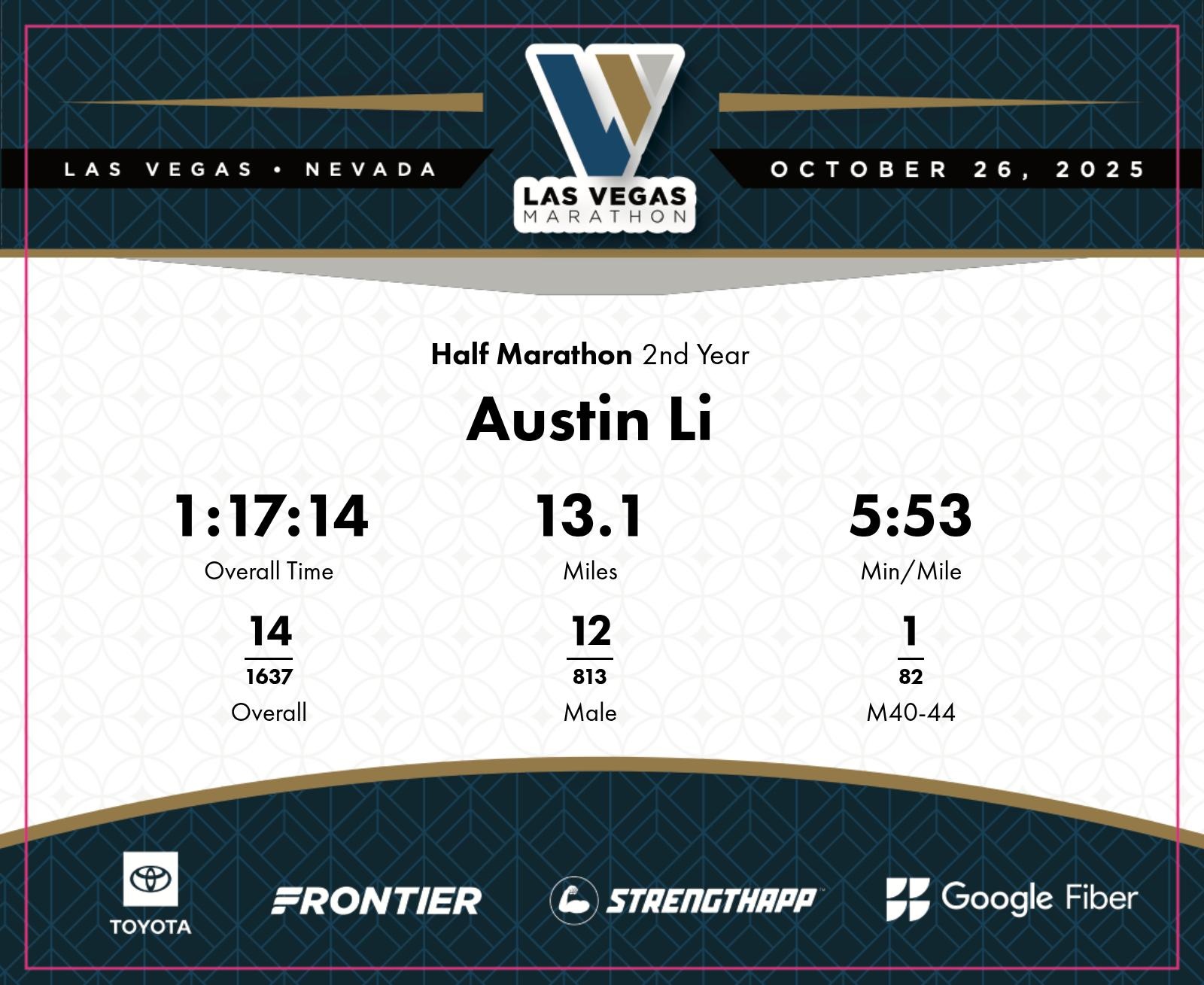 Date: Oct. 26, 2025 Participant: Austin Li #4205 Race: 2025 Las Vegas Half Marathon Distance: 13.1 miles