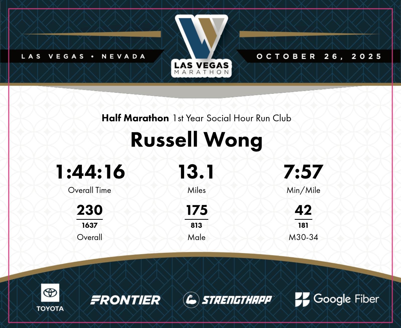 Date: Oct. 26, 2025 Participant: Russell Wong #4953 Race: 2025 Las Vegas Half Marathon Distance: 13.1 miles