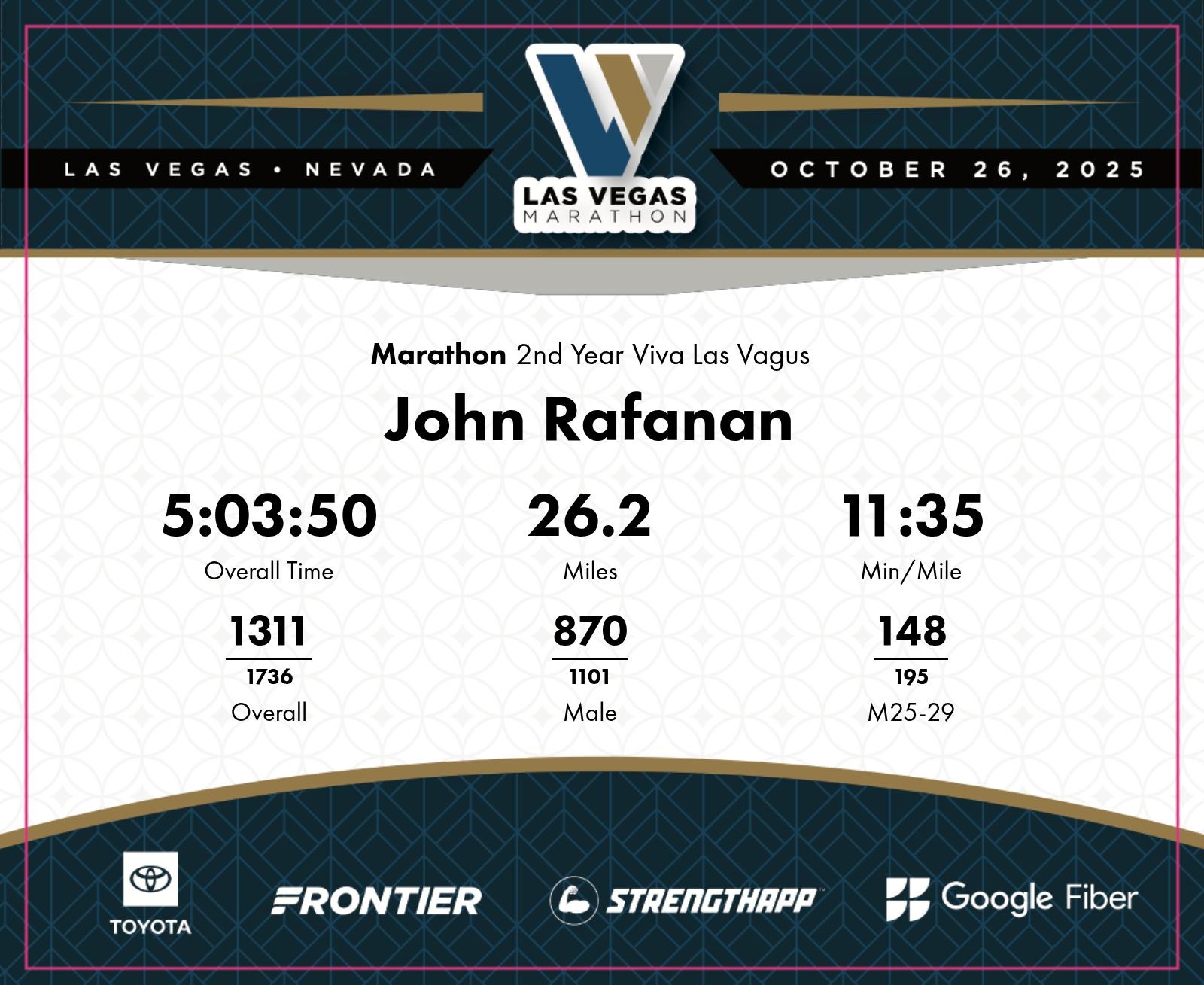Date: Oct. 26, 2025 Participant: John Rafanan #2510 Race: 2025 Las Vegas Marathon Distance: 26.2 miles