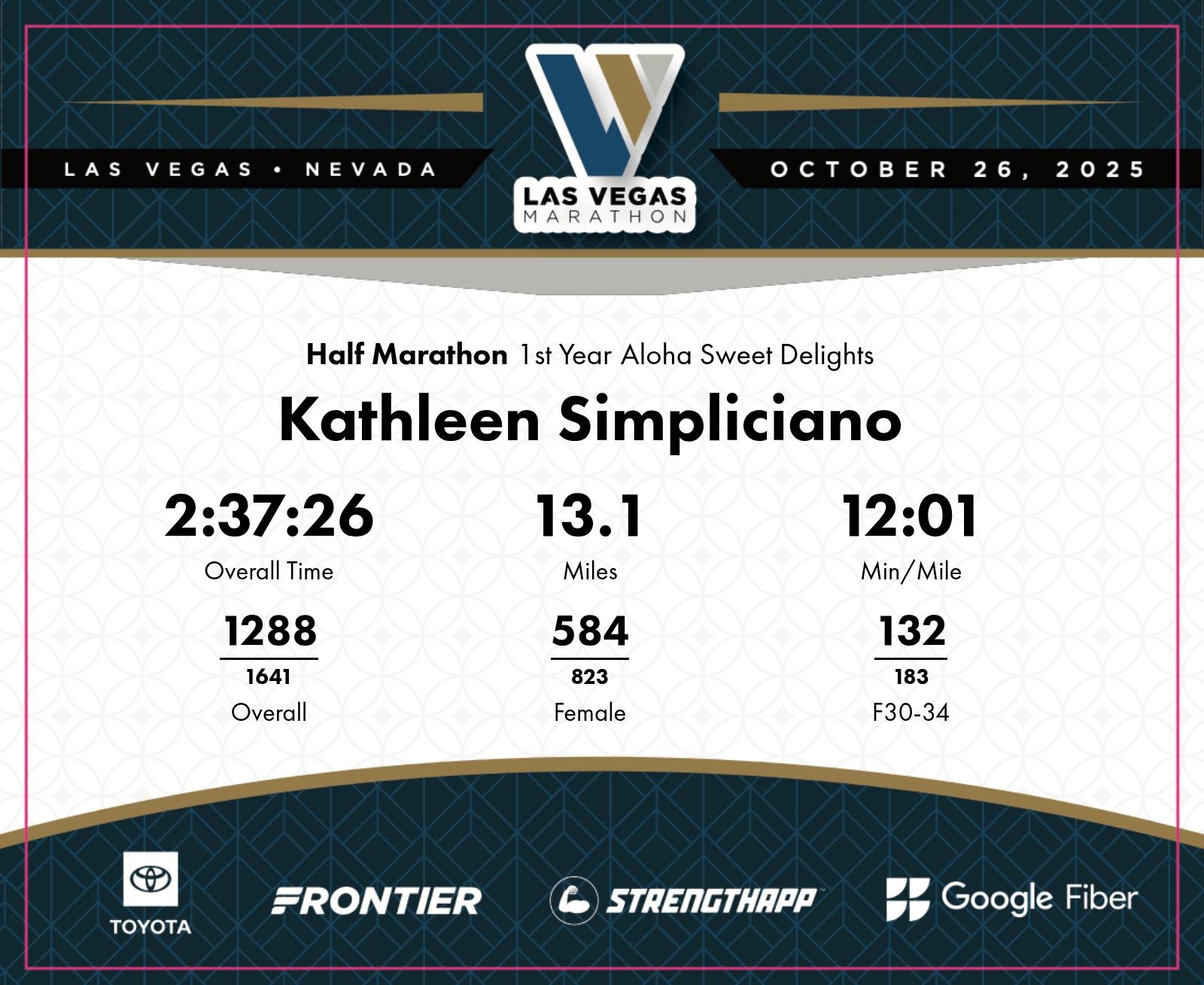 Date: Oct. 26, 2025 Participant: Kathleen Simpliciano #4721 Race: 2025 Las Vegas Half Marathon Distance: 13.1 miles
