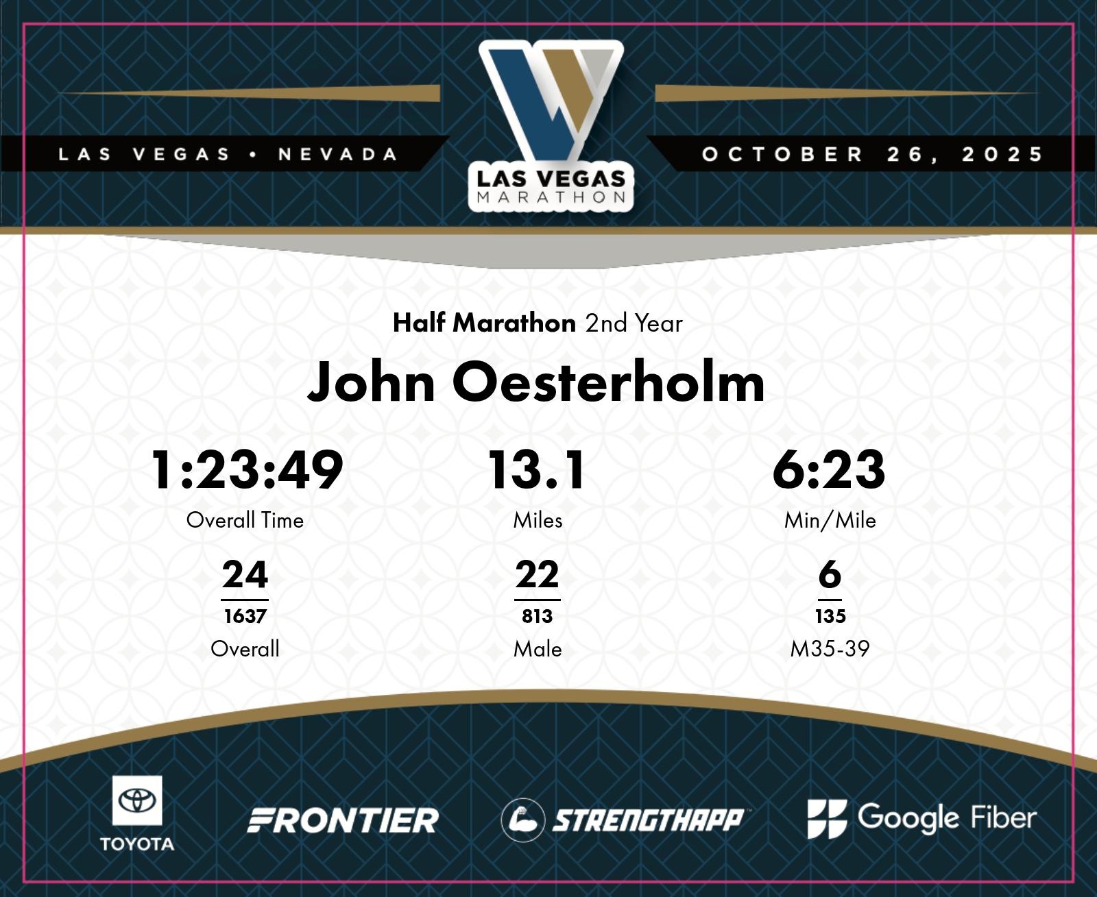 Date: Oct. 26, 2025 Participant: John Oesterholm #5066 Race: 2025 Las Vegas Half Marathon Distance: 13.1 miles