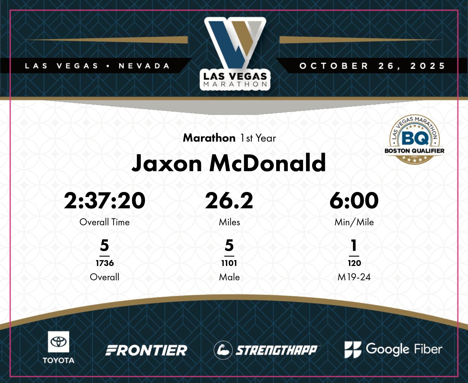 Date: Oct. 26, 2025 Participant: Jaxon McDonald #2256 Race: 2025 Las Vegas Marathon Distance: 26.2 miles