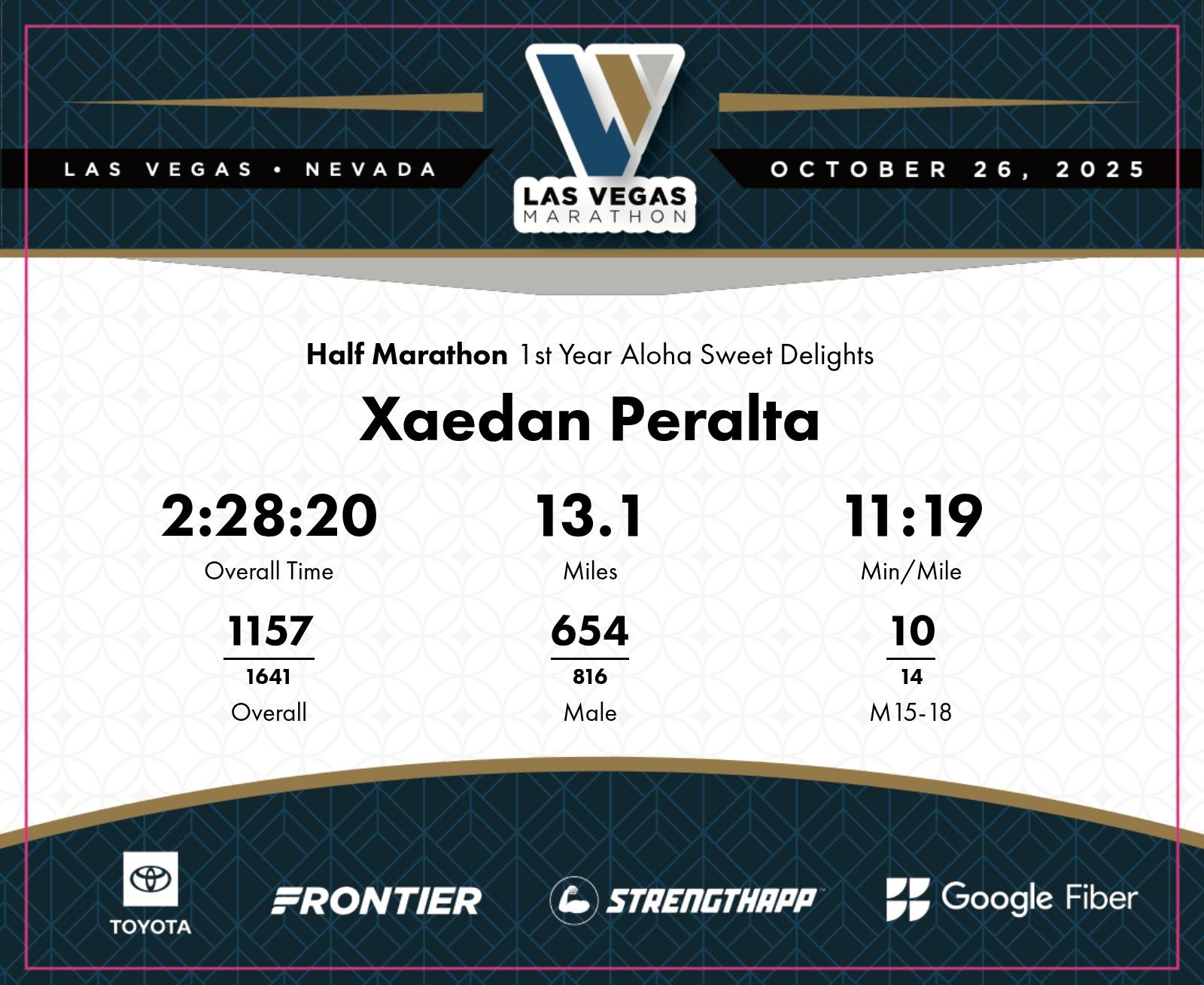 Date: Oct. 26, 2025 Participant: Xaedan Peralta #4489 Race: 2025 Las Vegas Half Marathon Distance: 13.1 miles