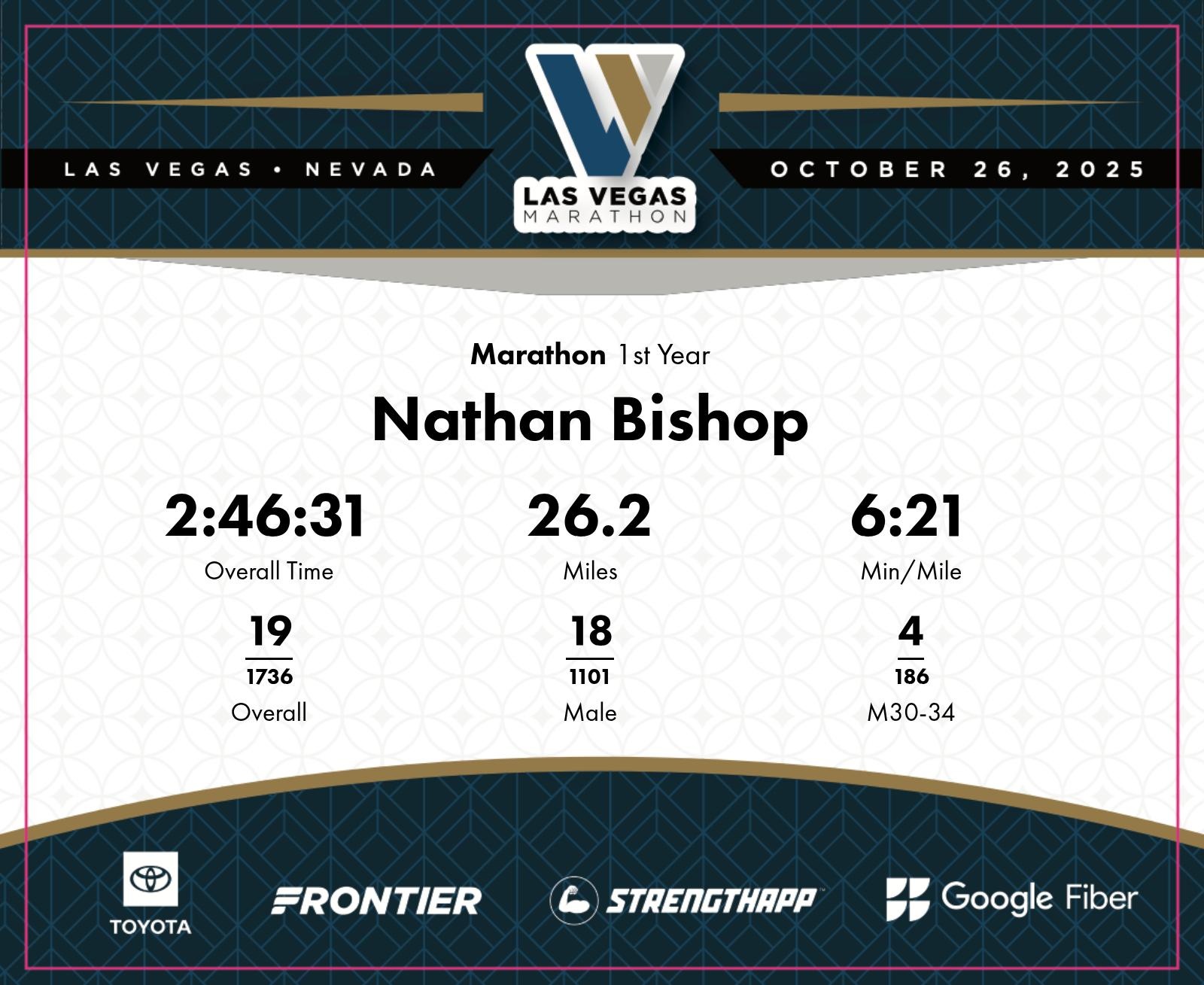 Date: Oct. 26, 2025 Participant: Nathan Bishop #1391 Race: 2025 Las Vegas Marathon Distance: 26.2 miles