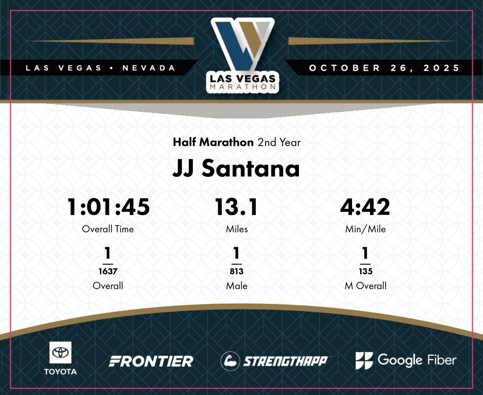 Date: Oct. 26, 2025 Participant: JJ Santana #4668 Race: 2025 Las Vegas Half Marathon Distance: 13.1 miles