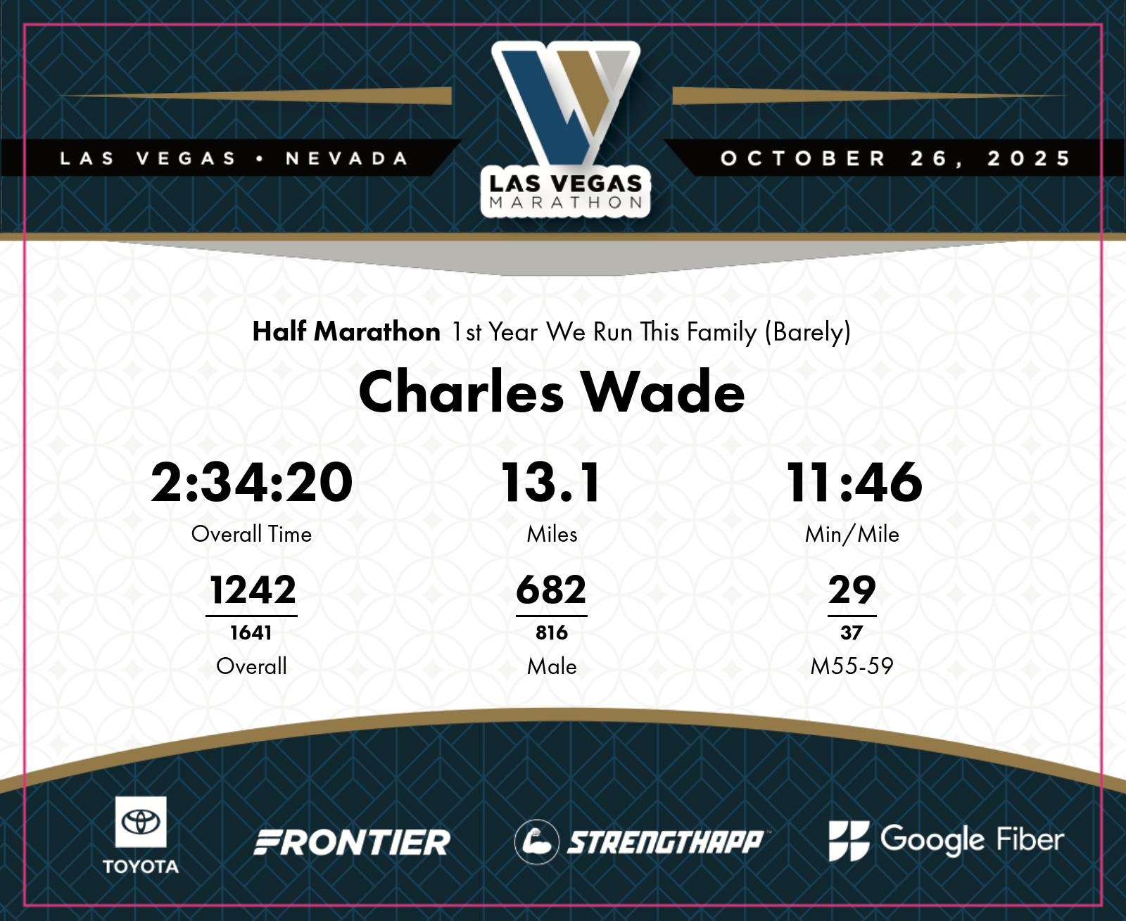 Date: Oct. 26, 2025 Participant: Charles Wade #4907 Race: 2025 Las Vegas Half Marathon Distance: 13.1 miles