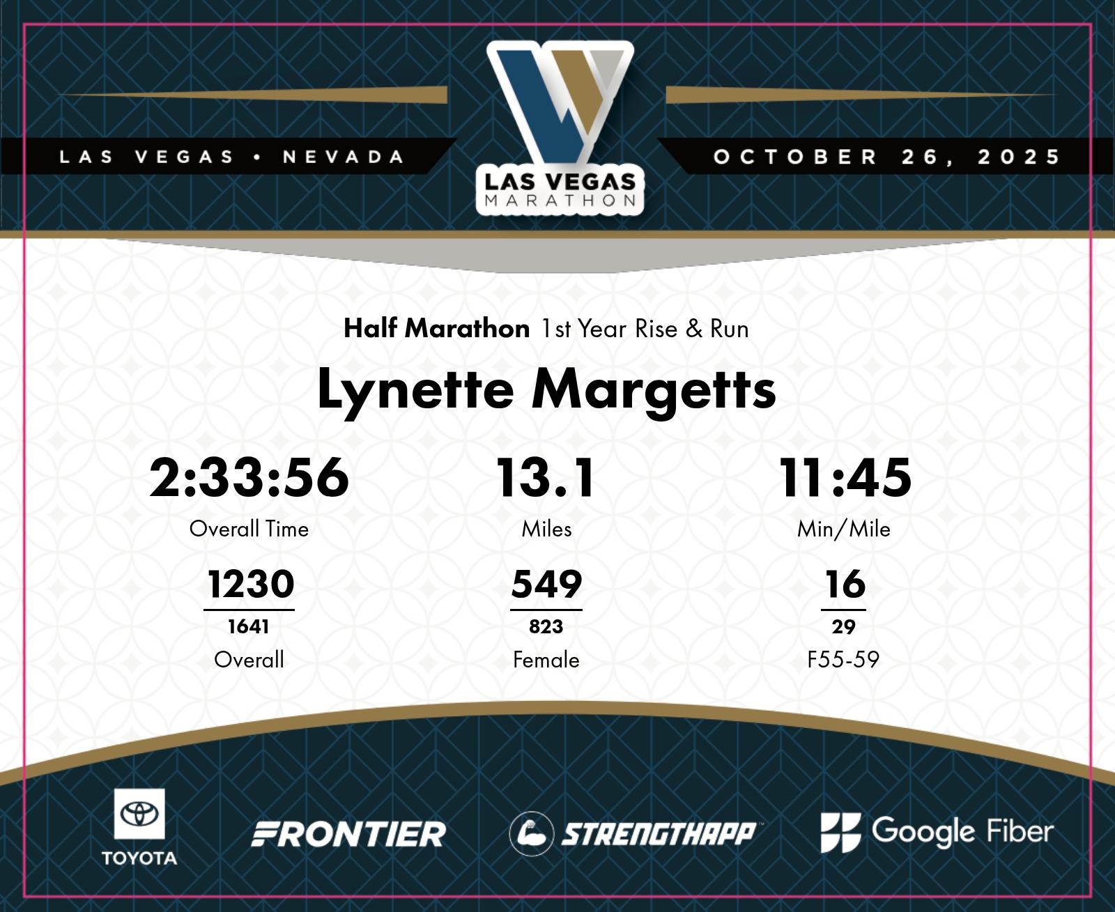 Date: Oct. 26, 2025 Participant: Lynette Margetts #4273 Race: 2025 Las Vegas Half Marathon Distance: 13.1 miles