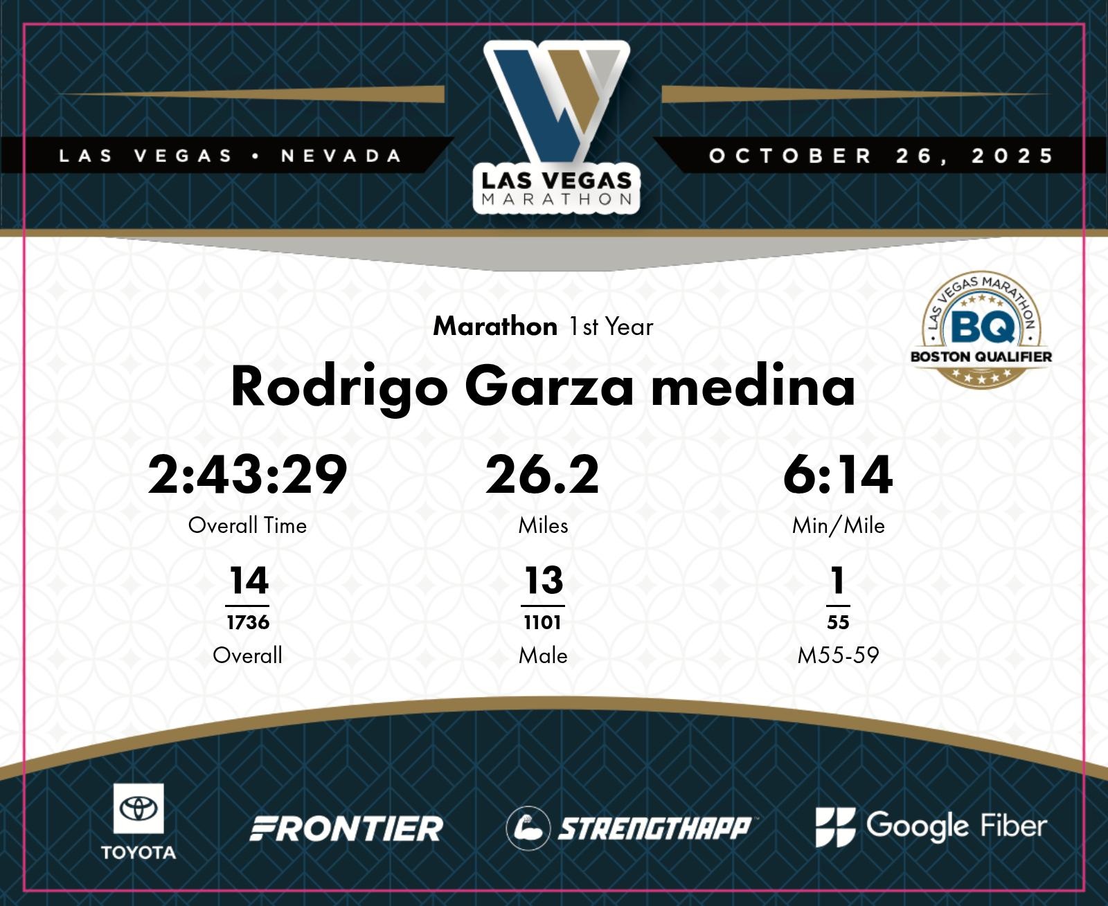 Date: Oct. 26, 2025 Participant: Rodrigo Garza medina #1799 Race: 2025 Las Vegas Marathon Distance: 26.2 miles