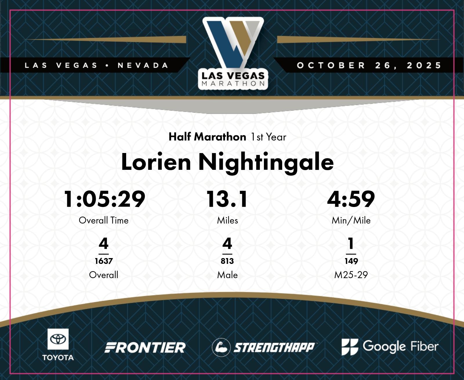 Date: Oct. 26, 2025 Participant: Lorien Nightingale #3335 Race: 2025 Las Vegas Half Marathon Distance: 13.1 miles